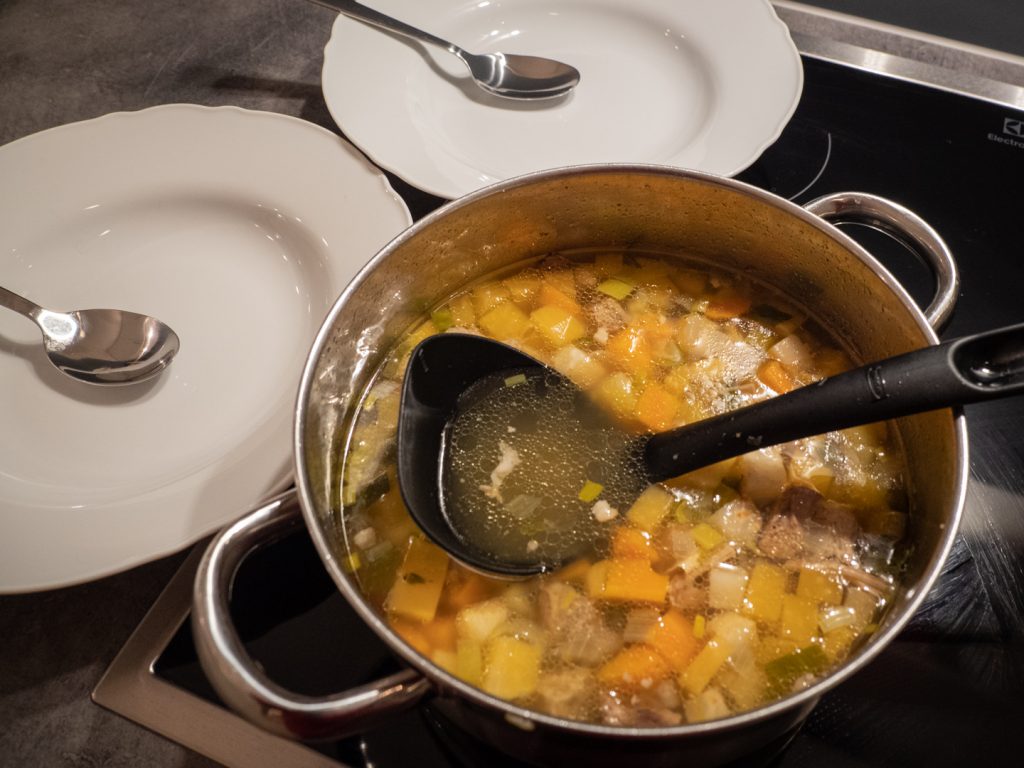 Dette var første gangen vi annonserte med kjøttsuppe etter høstdugnaden, som var 26.oktober – en fin, men kjølig høstkveld. Tanken var å lage den i en stue og fordele den utover til alle stuene. Det ble annonsert både via Heime-appen og oppslag. Påmelding var via Heime-appen, med mulighet for å melde seg på også til blokkontakten siden både dugnadssuppe og Heime-appen er ny. Bare 18 meldte seg på – men folk fra alle blokker var representert. Ikke flere enn en stue rommer alene. Via den samme appen ble det derfor sendt ut endringsmelding direkte til alle påmeldte via en Heimeapp-funksjon om at suppen bare ble servert i blokk 3.